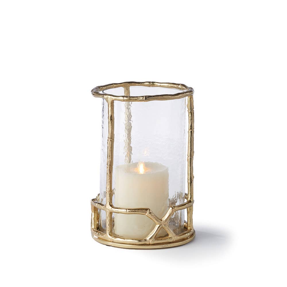 The gold bamboo-like structure and seeded glass insert are a great way to dress up your space.