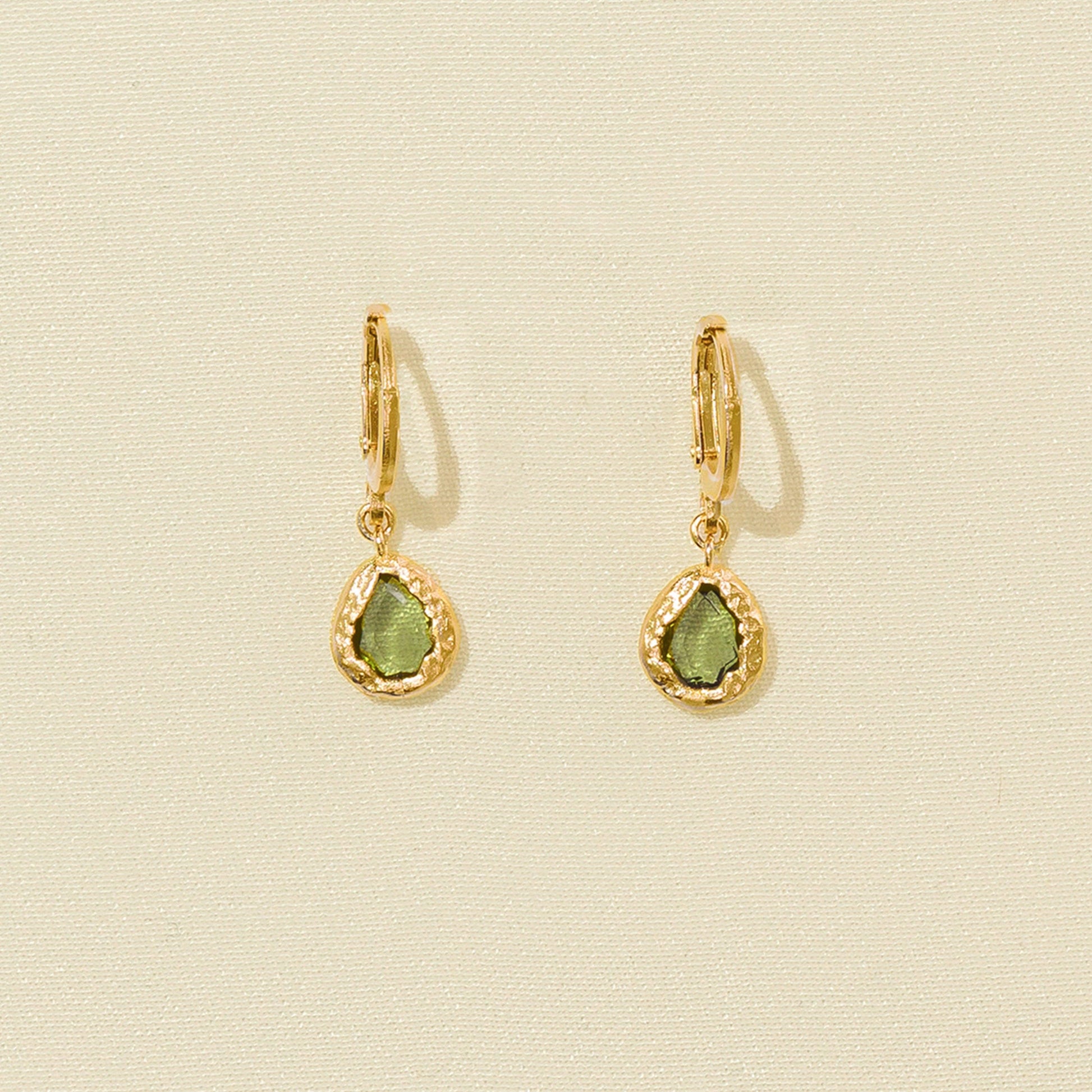 Set in a textured gold nest, the dark green peridot glass stones of our Lysia earrings are like delicate leaves glistening under the sun.